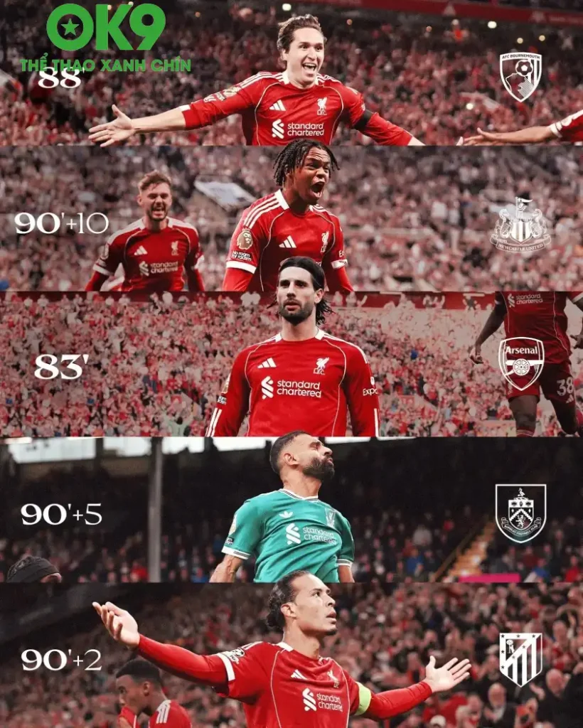 Từ Ngoại Hạng Anh đến UEFA Champions League, Liverpool đã có những chiến thắng nghẹt thở nhờ những bàn thắng ở phút chót. Liệu mùa giải này, The Kop có thật sự là “chân mệnh thiên tử”? Anh em hãy cùng OK9 khám phá nhé!